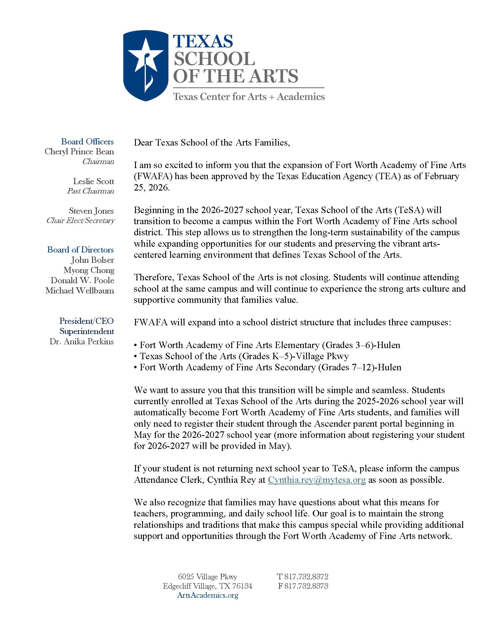 Please label it Texas School of the Arts Transition Parent Letter and FAQ